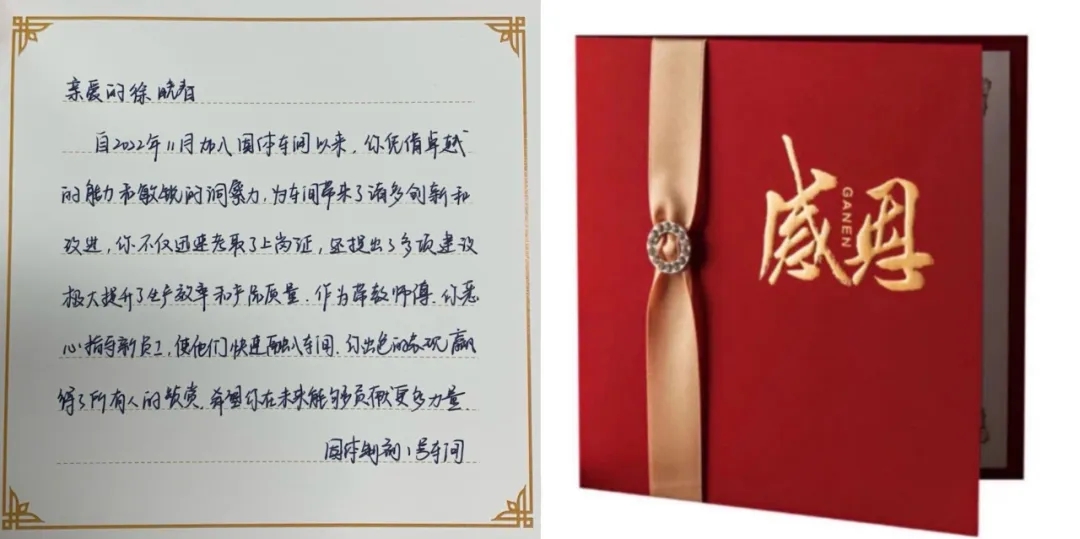 感謝卡:自2022年11月加入固體車間以來,你憑借卓越的能力和敏銳的洞察力,為車間帶來了諸多創新和改進,你不僅迅速考取了上崗證證,還提出了多項建議,極大提升了生產效率和產品質量。作為帶教師傅,你悉心指導新員工,使他們快速融入車間。你出色的表現贏得了所有人的贊賞,希望你在未來能夠貢獻更多力量。