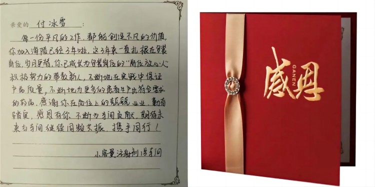 感謝卡:每一份平凡的工作,都能創(chuàng)造不凡的價(jià)值,你加入海陵已經(jīng)3年啦,這3年來(lái)一直扎根在包裝崗位,歲月更替,你已成長(zhǎng)為包裝崗位的“崗位放心人”。積極努力地帶教新人,不斷地在實(shí)踐中保證產(chǎn)品質(zhì)量,不斷地為更多的患者生產(chǎn)出符合要求的藥品。感謝你在崗位上的兢兢業(yè)業(yè),勤奮踏實(shí),感恩有你,不斷為車間貢獻(xiàn),期待未來(lái)與車間繼續(xù)同頻共振,攜手同行!